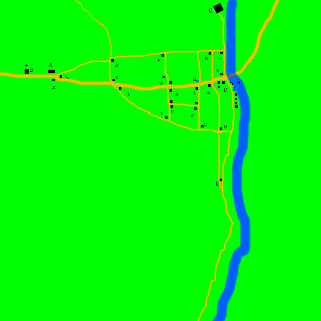 J: “Genral Stor”[sic] A moderately large, wooden, two-story building. The entire ground floor is the store itself which carries a regular selection of commonly-needed goods plus an ever-changing selection of other random items that have become available for trade. The kindly old couple that run the place live upstairs. A small yard in the back has a small garden, a clothesline, and a tiny stable for the pony.
